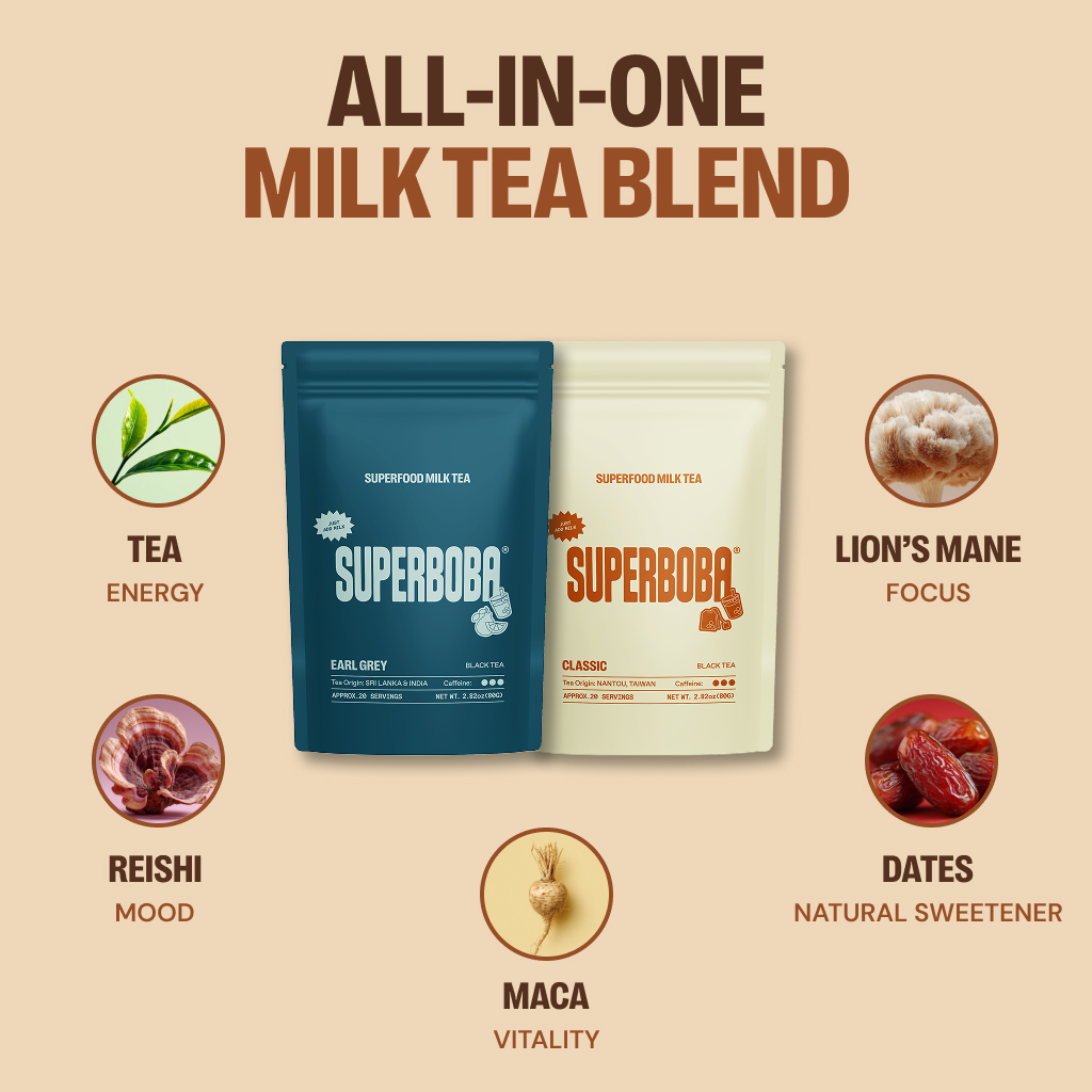Superboba is the first functional milk tea designed for sustained energy, mental clarity, and overall wellness.