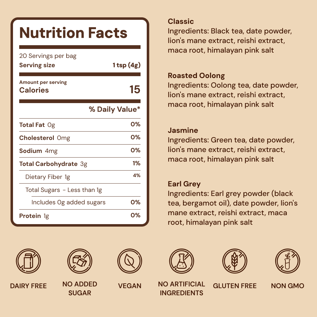 It's just tea, date powder, lion's mane extract, reishi extract, maca root and himalayan pink salt!