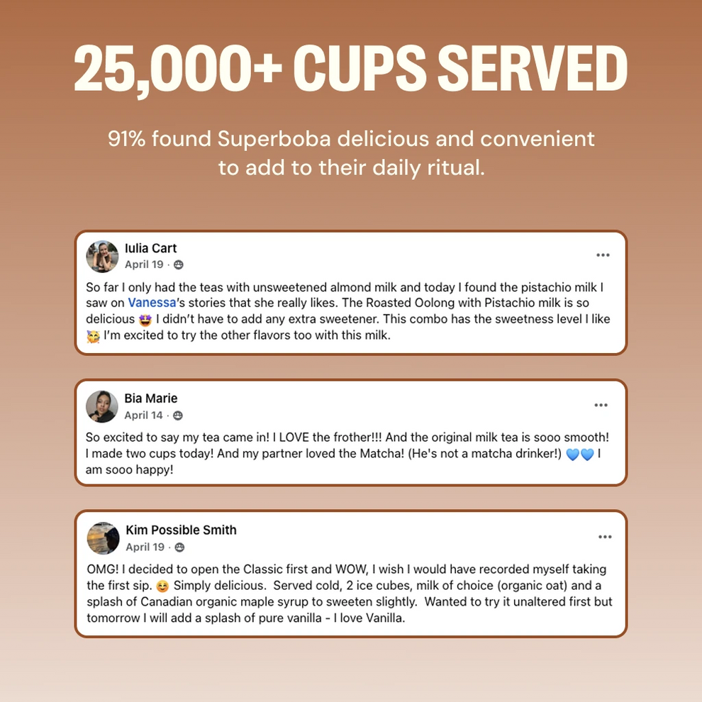 Superboba is made with premium tea powder sourced directly from renowned tea regions and our superfoods (lion's mane, reishi, maca and dates) and a pinch of salt. Our clean formula contains zero artificial ingredients or preservatives.
