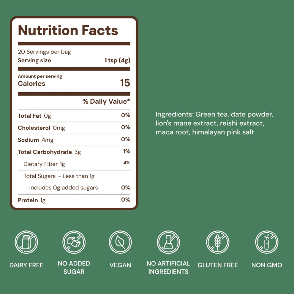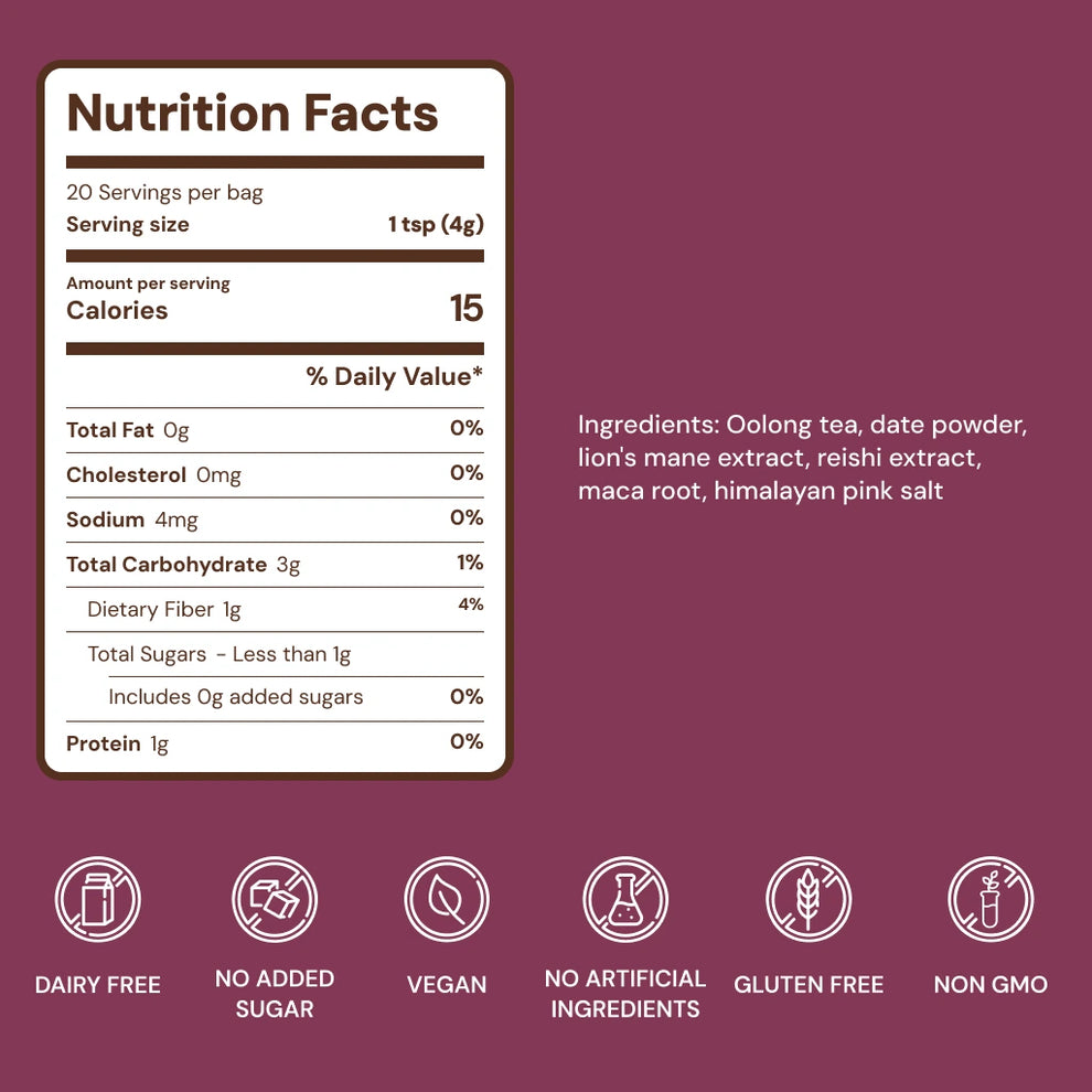 Black tea, Organic dates, Organic Lion's Mane, Organic Maca, Organic Reishi, Himalayan Pink Salt