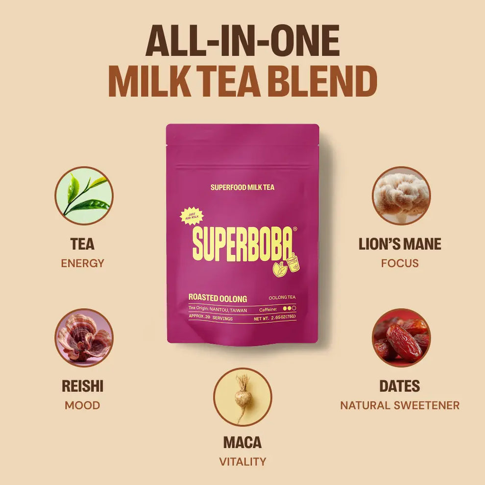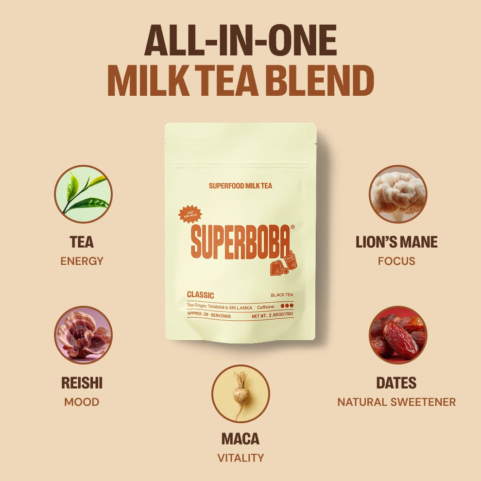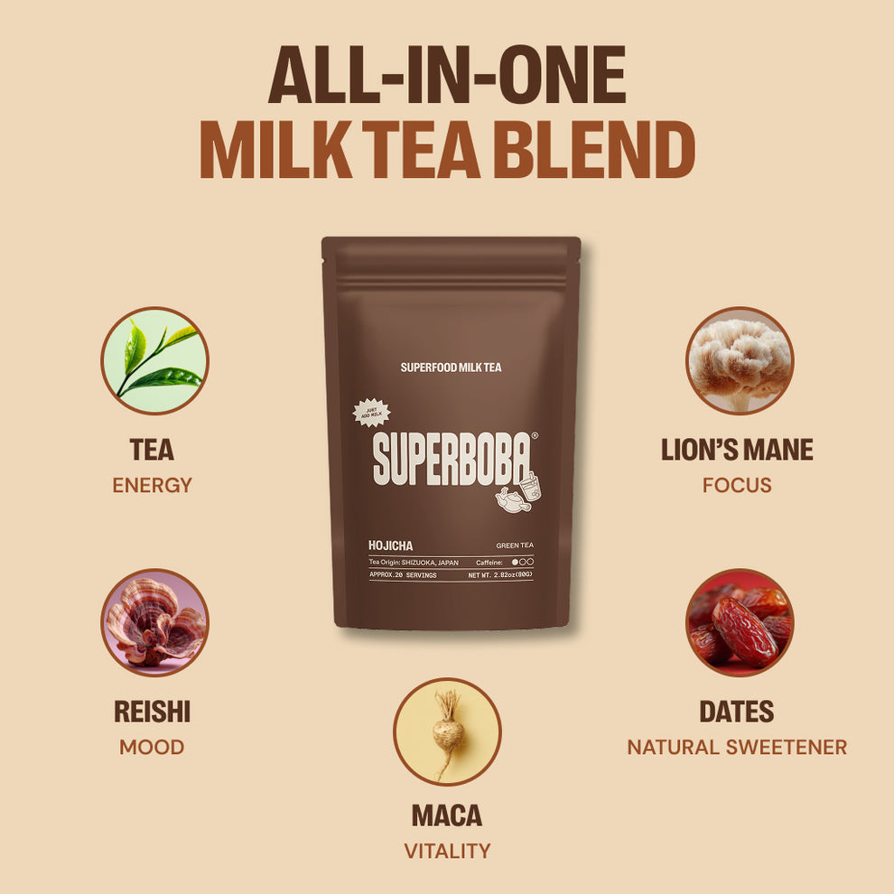 Superboba is made with premium tea powder sourced directly from renowned tea regions and our superfoods (lion's mane, reishi, maca and dates) and a pinch of salt. Our clean formula contains zero artificial ingredients or preservatives.