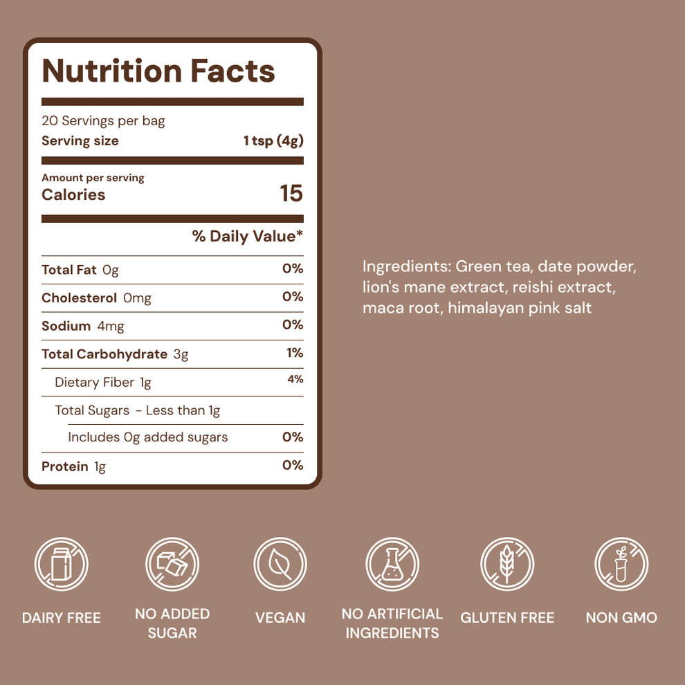 Oolong tea, Organic dates, Organic Lion's Mane, Organic Maca, Organic Reishi, Himalayan Pink Salt